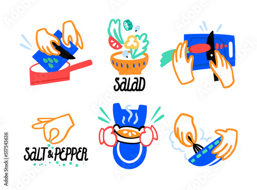 © Sashakasha, Naklejka premium Set of illustrations about cooking. Vector doodle style. Salad, frying pan, apron, pie, beating dough, salt and pepper, carrot, shred, knife.