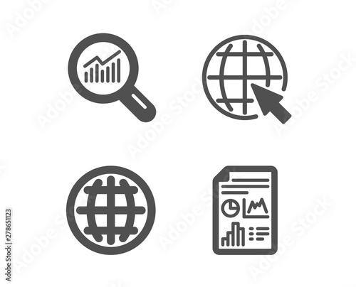 © blankstock, Obraz premium Set of Internet, Globe and Data analysis icons. Report document sign. World web, Internet world, Magnifying glass. Growth chart. Classic design internet icon. Flat design. Vector