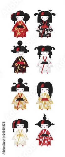 Naklejka premium Set of japanese traditional Kokeshi dolls in national costumes kimono in...