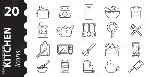 © Yuliya Lins, Naklejka premium Set of kitchen icons. Linear style. Flat design. Frying pan, chefs hat, chopping Board and kitchen utensils.