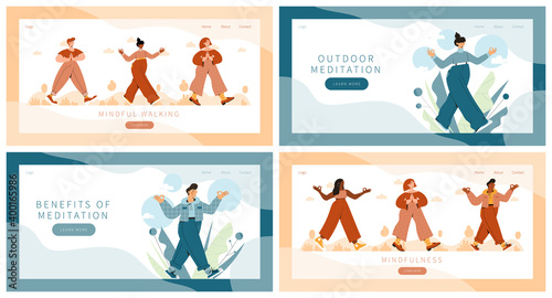 Naklejka premium Set of landing pages with people practicing mindful walking exercise in...