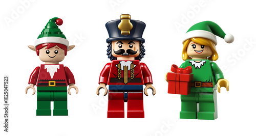 © Kyrtap_Studio, Naklejka premium Set of 3 lego figures. Christmas Elf, Nutcracker, Elf with present.