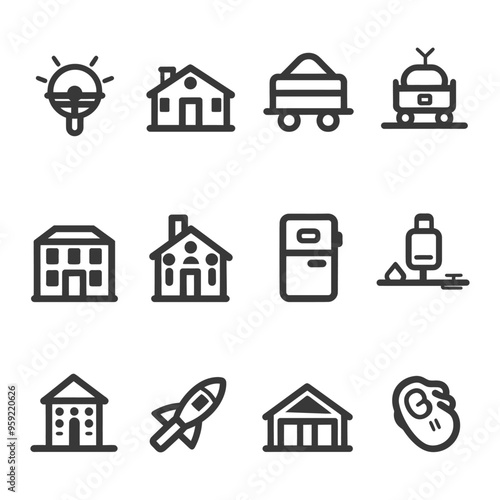 Fototapeta premium Set of 12 Line Icons for Buildings Transportation and Technology