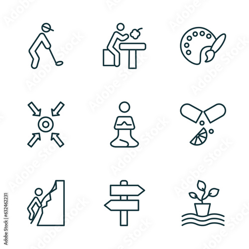 © Farahim, Fototapeta premium set of 9 linear icons from activity and hobbies concept. outline icons such as golf playing, lace making, coloring, rappelling, , hydroponics vector