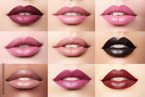 Obraz premium set of lips wearing various shades of lipstick pink plum neutral black...