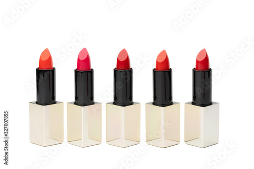 Obraz premium Set of lipstick isolated on white background. Red, Pink and Orange color in various toned.