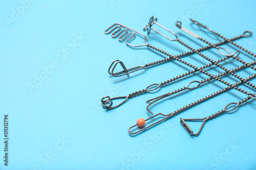 © New Africa, Fototapeta premium Set of logopedic probes for speech therapy on light blue background