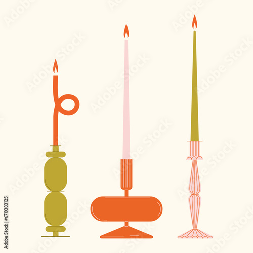 Naklejka premium Set of long candles in glass candlesticks. Trendy home design illustration....