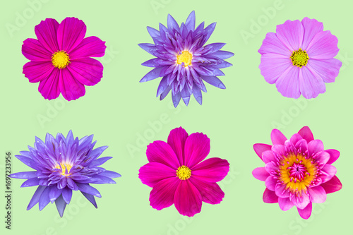 © Suraphol, Naklejka premium Set of Lotus and cosmos flowers isolated on light green background. top view