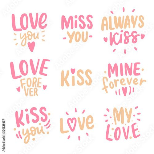 Obraz premium Set of love lettering stickers. Modern hand drawn typographic feeling words.