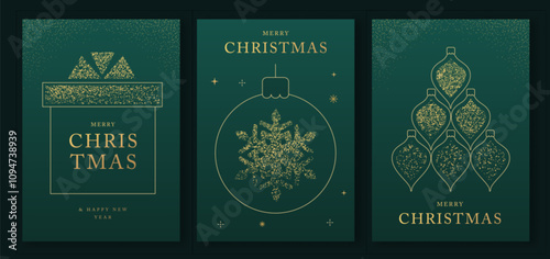 Fototapeta premium Set of luxury Merry Christmas and Happy New Year greeting cards, covers or posters with gold holiday decoration. Christmas green background. Vector illustration