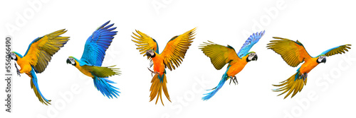 © Passakorn, Fototapeta premium Set of macaw parrot flying isolated on transparent background.