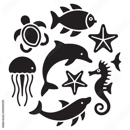 © SagorKundu, Naklejka premium Set of marine animals black silhouette in cartoon style, cute sea animals isolated on white background, sea fish desing alements for poster, card, printing characters.