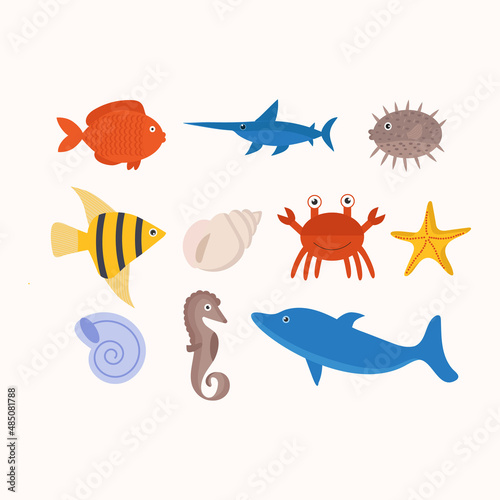 © Елена Барская, Naklejka premium Set of marine animals on a white background