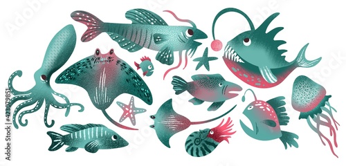 © sofya_bsa_paws, Naklejka premium Set of marine life on a white isolated background. Trending colors. Octopus, stingray, hammerhead shark, mollusc, jellyfish, starfish, etc. Can be use for poster, textile, postcard