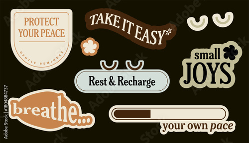 © AdhinesaDaffa, Fototapeta premium Set of mental health and self-care stickers. A collection of retro earthy-toned typography labels with positive quotes like "Protect Your Peace" and "Take It Easy" for journals or laptops.