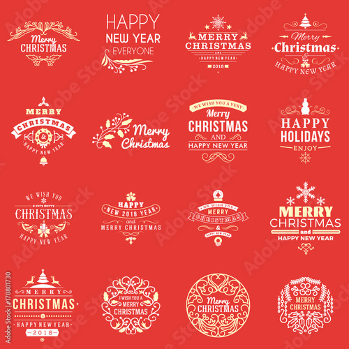 © antartstock, Fototapeta premium Set of Merry Christmas and Happy New Year Decorative Badges for Greetings Cards or Invitations. Vector Illustration. Typographic Design Elements