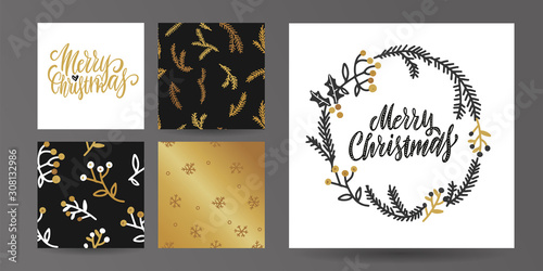 © LanaSham, Fototapeta premium Set of Merry Christmas card templates. Hand drawn seamless patterns with lettering. Golden metallic, black, white colors. Holiday greetings. Template for Greeting