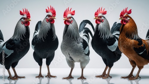 © CryptoCanvas, Fototapeta premium Set of miniature bantam fowl, ornamental breed, captured in diverse angles, isolated male chicken on white background