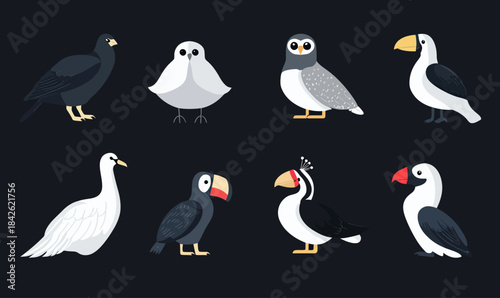 Fototapeta premium Set of minimalist flat vector bird icons including raven, snowy owl, barn owl, toucan, swan, puffin, hornbill, and black bird illustrations on dark background