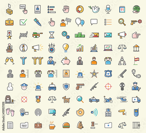 Fototapeta premium Set of 100 Minimalistic Solid Line Colored Political and Police Icons....