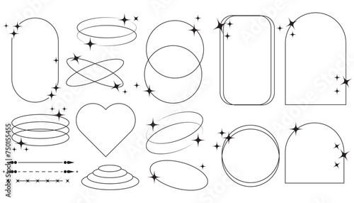 Fototapeta premium Set of Modern minimalist aesthetic line elements, geometric, trendy linear frames with stars, geometric forms. Brutalism design with Y2K style. Geometric element design.