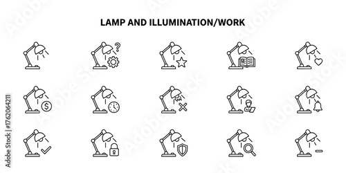 Fototapeta premium Set of monochrome linear icons depicting lamp and illumination/work functions