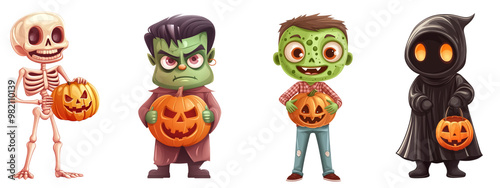 © Chananphat, Fototapeta premium Set of monster character in cartoon style holding a jack o lantern, isolate on transparent background