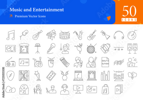 © Blinix Solutions, Naklejka premium Set of music icons. music and entertainment web icons in thinline style. music note, mic, guitar, piano, drum, trumpet icon collection. Line icons pack. vector illustration ai eps file
