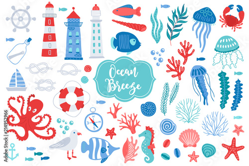 Obraz premium Set of ocean design elements - lighthouse, fish, shell, seaweed, jellyfish