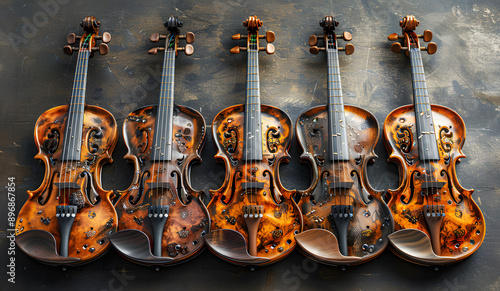 © Lucky, Naklejka premium Set of old brown Violin arranged in rows on white background, diagonal. Bioengineered musical instruments living violins and realesrgan. Musical instrument in group of classical stringed instruments.