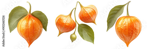 © Vasyl Onyskiv, Fototapeta premium Set of orange physalis lantern flowers with delicate veins, isolated on white transparent background. Concept of nature and botanical beauty