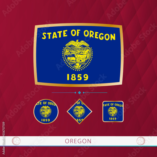 © boldg, Naklejka premium Set of Oregon flags with gold frame for use at sporting events on a burgundy abstract background.