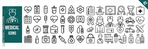 Naklejka premium Set of 42 outline icons related to Medical. Linear icon collection. Vector...