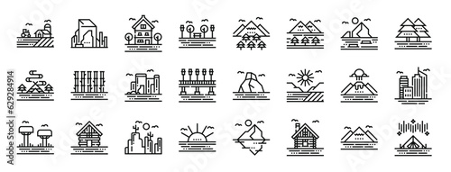 © MacroOne, Fototapeta premium set of 24 outline web landscapes icons such as farm, cave, house, park, forest, lake, glacier vector icons for report, presentation, diagram, web design, mobile app