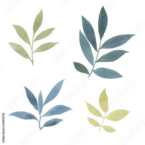 © Sergei, Fototapeta premium Set of painted watercolor leaves. isolated leaves on a white background. Watercolor leaves for printing, packaging, cards. botanical elements