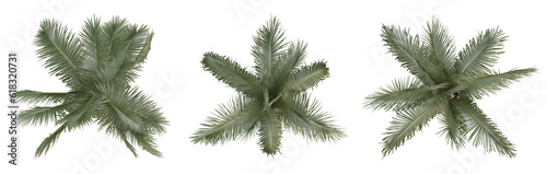 © Sandy, Naklejka premium Set of palm trees on top view isolated on transparent background, 3d render illustration.