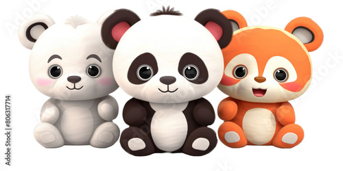 Naklejka premium set of panda, elephant and red fox stuffed fluffy plushie animal toys isolated on a transparent background