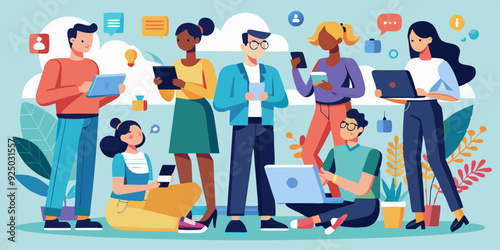 © VectorVibe, Naklejka premium Set of people using gadgets in lifestyle. Business men and women use phones, tablets and laptops