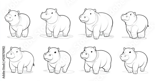 Fototapeta premium Set of playful hand-drawn hippos in line art style featuring adorable baby hippo illustrations as vector icons ideal for children’s projects or animal-themed designs