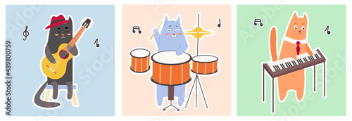 © Яна Зиновкина, Fototapeta premium Set of Postcards with Cats Musicians Playing Musical Instruments - drums, guitar, piano. Collection of cute Kitty Stickers. flat illustration