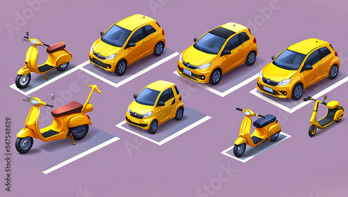 © Prateek, Naklejka premium Set of realistic 3d yellow car, scooter, bicycle, skateboard and kick scooter, Advertising poster of different vehicles company, 3d illustration in cartoon style