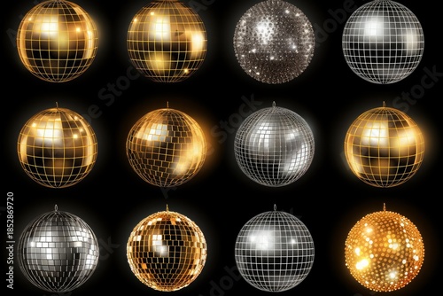 © nsit0108, Fototapeta premium Set of realistic golden and silver disco balls reflecting light on black background
