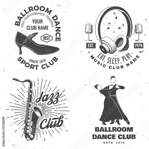 © sivvector, Naklejka premium Set of retro music and ballroom dance sport club logos, badges design. Dance sport and retro music sticker with microphone, headphones, saxophone, shoes for ballroom dancing, man and woman silhouette