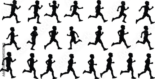 © Arman Creatives, Naklejka premium Set of running boy silhouettes in various poses, children jogging and exercising vector illustration collection for fitness and health content.
