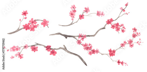 © Nataliia, Obraz premium Set of sakura branches. Watercolor handmade collection of sakura. Delicate illustrations for fabric, wallpaper, greeting cards, design, decoration and illustration.
