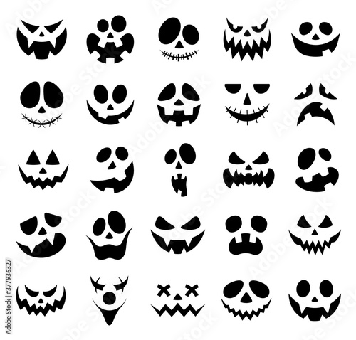 © Valeriia, Naklejka premium Set of scary and funny faces of Halloween pumpkin isolated on white background.