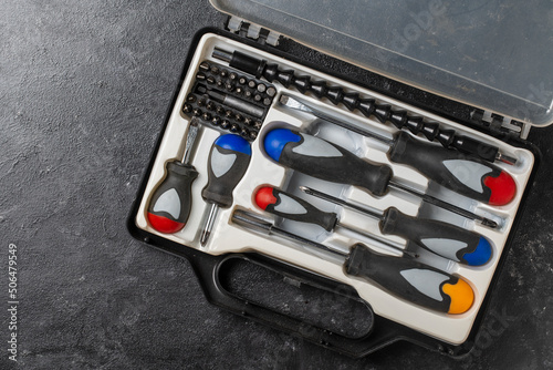 Fototapeta premium Set of screwdrivers inside toolbox, top view. Set mechanical tools in box