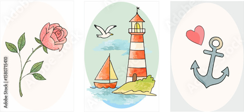 Obraz premium Set of sea and romantic vector illustrations - lighthouse, anchor, rose,...