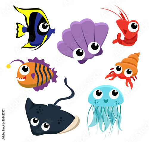 © Johnstocker, Fototapeta premium Set of sea creatures on white background vector